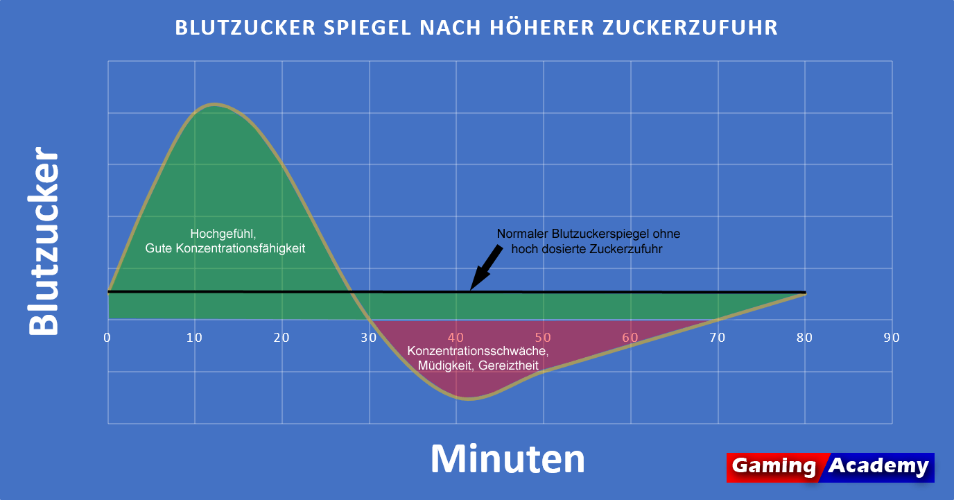 Consuming too much sugar before and during gaming is bad in two ways. On the one hand, it causes an enormous fluctuation in your ability to concentrate and, on the other, in your own emotional state. This means that you get upset more quickly and the risk of losing your temper increases.