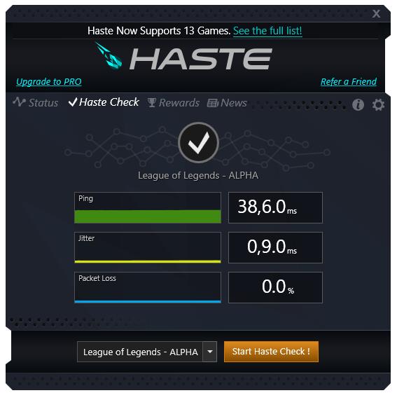 If all the measures described above do not work, there is still hope that there will soon be a software solution to this problem. The Haste software is currently in the closed alpha testing phase for Europe (21.01.2018). In addition to League of Legends, the software optimizes the signal path from your computer to the game server for a number of the most important e-sports games such as Dota2, CS:GO or PUBG. The term “Haste” translates directly from English as “haste”. Many old-school gamers will remember the term from the first-person shooter Quake. In the USA, the software has already been in use for some time and is used extensively by pro gamers and ambitious gamers alike. However, it remains to be seen whether the effect can be applied just as positively to the European Internet infrastructure. Telekom in particular already uses fast-path technology as standard for all connections with a media streaming package. Especially as the German ISP market is not quite as fragmented as in the USA, which also has completely different signal path problems in terms of area than we do here in Germany/Europe. It also includes a test tool with which you can test your signal quality directly to the game server. Here is a screenshot of what such a test result looks like:
