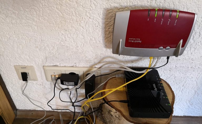 If your Telekom connection has already been switched to VDSL 2 with vectoring, we recommend that you connect a Zyxel modem router in front of the Fritzbox. This is because the somewhat older Fritz Boxes, such as the 7390 in our picture, do not really cope well with the very sensitive vectoring that Telekom uses in its switching boxes. Vectoring is used to achieve higher data transfer rates via copper cable over the last few meters to your home. In principle, there is nothing wrong with this, but not all devices can cope with it. The problem becomes noticeable when the Fritz box constantly loses the DSL connection and resynchronizes. It cannot be completely resolved by changing the settings or updating the firmware on the Fritz box! In our case, even the additional Zyxel connected upstream to the somewhat outdated Fritz Box 7390 improved the average ping from 35ms to 25ms. What’s particularly cool about the variant with the upstream Zyxel is that you can continue to use your existing, somewhat older Fritz Box without any problems, and of course keep your entire old configuration! Here is a picture of a typical Zyxel / Fritz-Box modem/router setup:
