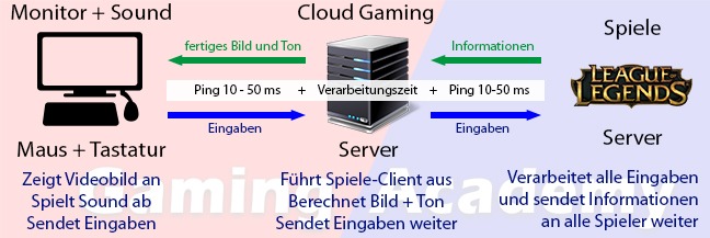 Die grundsätzliche Funktionsweise ist so, dass ihr nur die Eingaben von Maus + Tastatur an einen virtuellen Rechner in der Cloud weiterleitet. Cloud-Gaming Anbieter betreiben große Server Zentren, in denen ihr quasi einen eigenen virtuellen Rechner zur Verfügung habt, auf dem ihr eure Anwendung installiert. In unserem Fall z.B.: League of Legends. D.h.: das Spiel wird auf dem Cloud Server ausgeführt, nicht bei Euch auf dem Rechner.